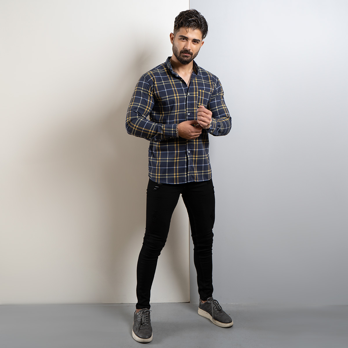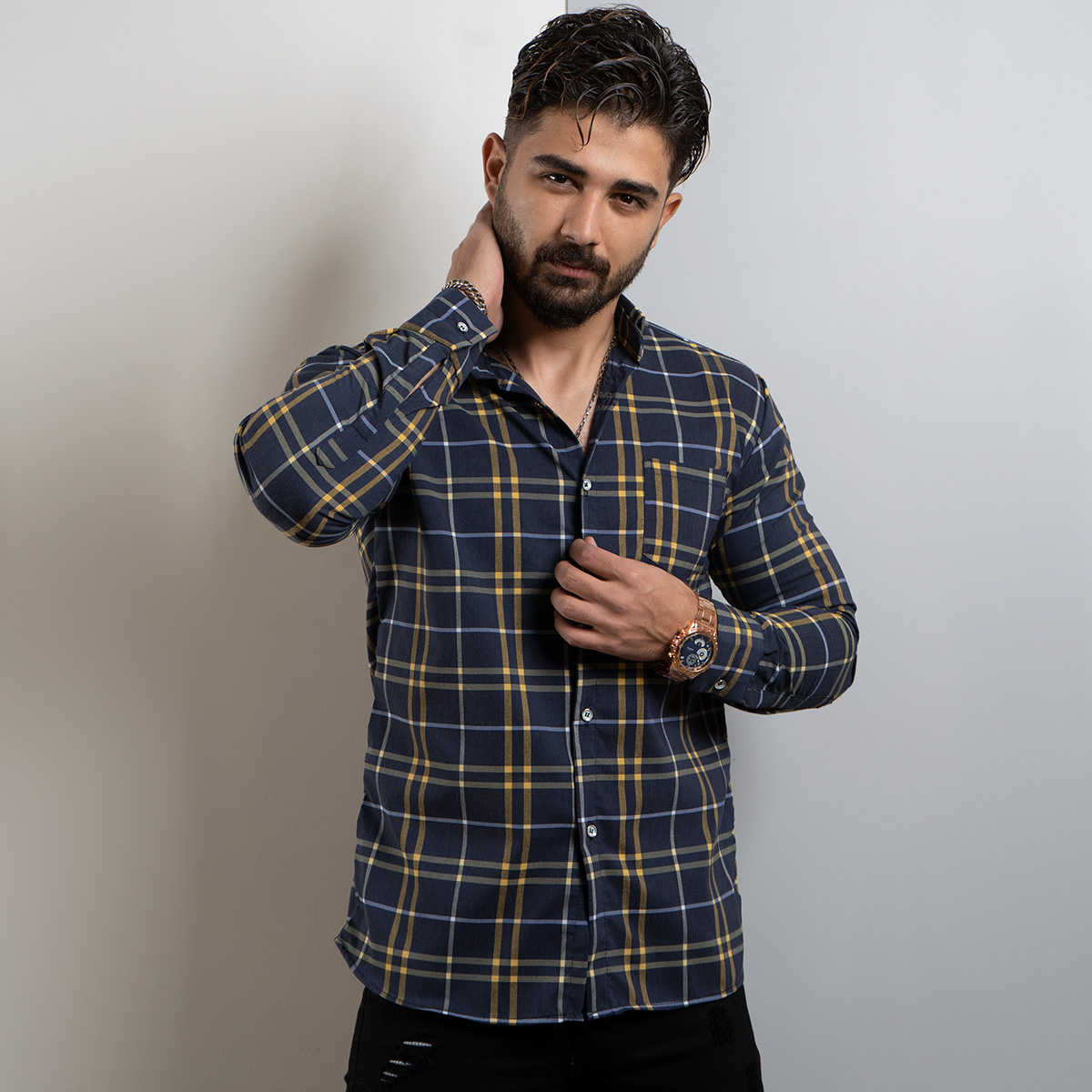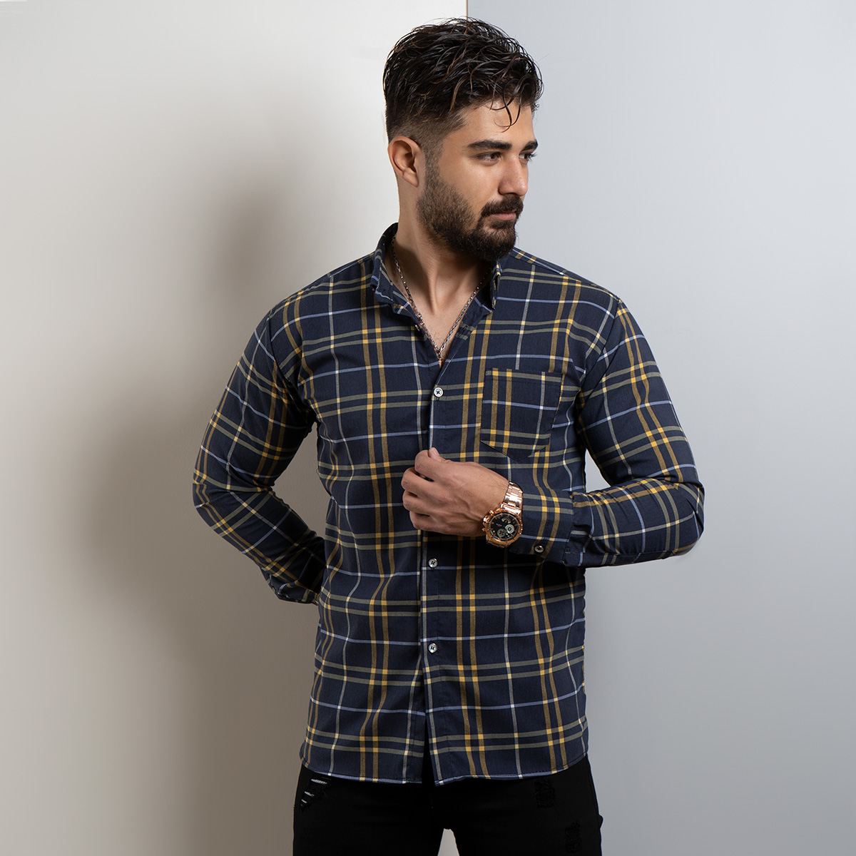پیراهن راه راه مردانه سرمه ای زرد مدل arshia