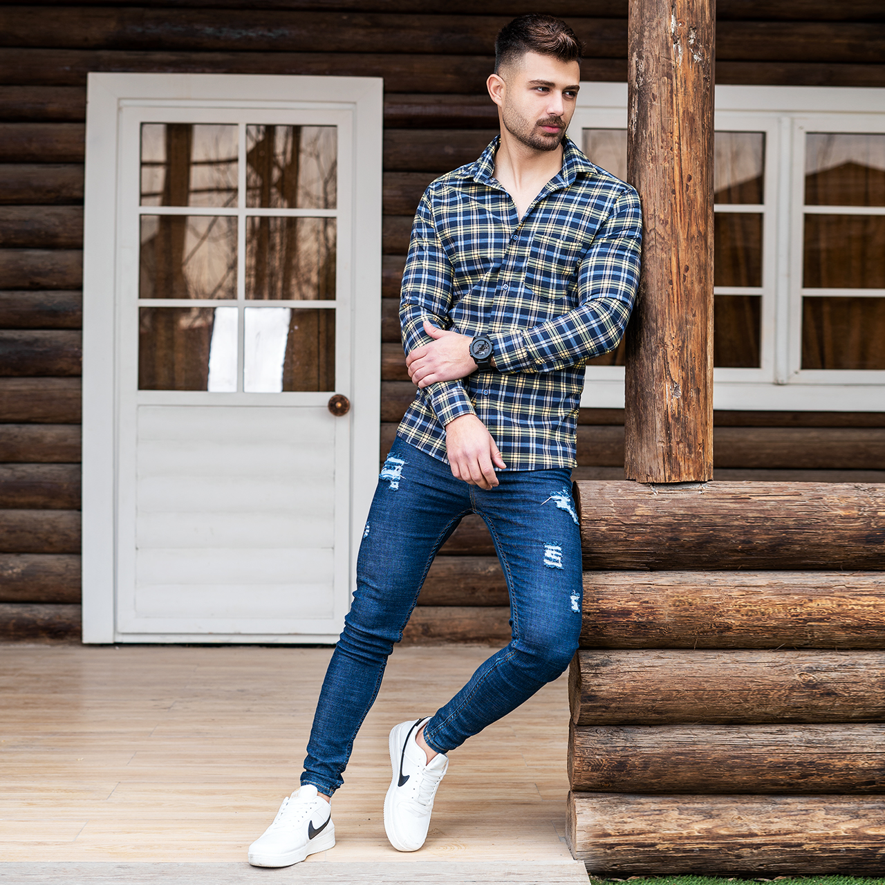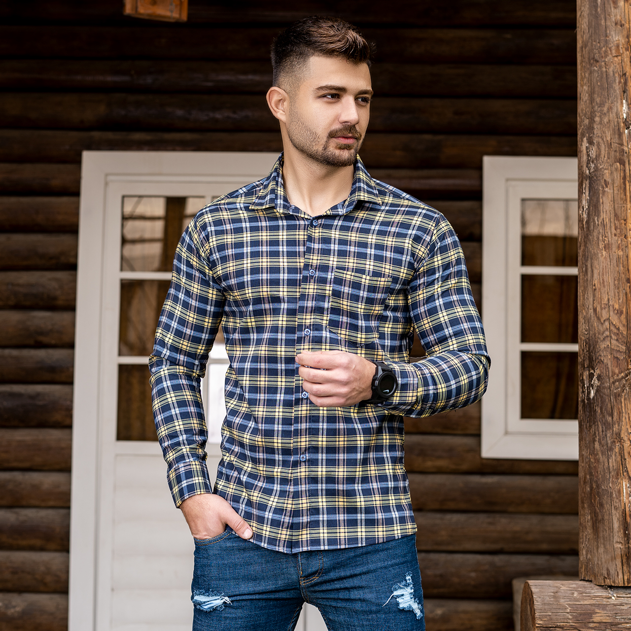 دوتا پیراهن چهارخانه زرد سرمه ای مردانه مدلDivan